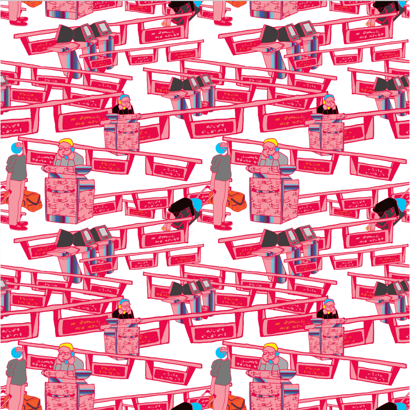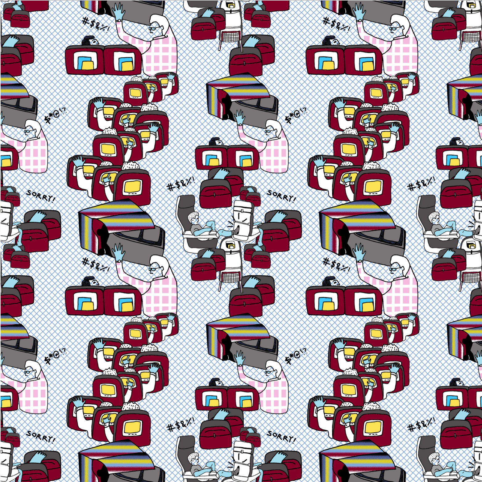 For AIR-E, my concept airline, I wanted to take these stressful experiences and incorporate them into patterns which would entertain all kinds of flyers, from infants to the elderly. By bringing out the humor in awkward airport experiences, AIR-E brightens up the spaces in airplanes and airports. Entertaining flyers in uncomfortable situations, AIR-E makes your flying experience a more pleasant one. Thank you for flying AIR-E.